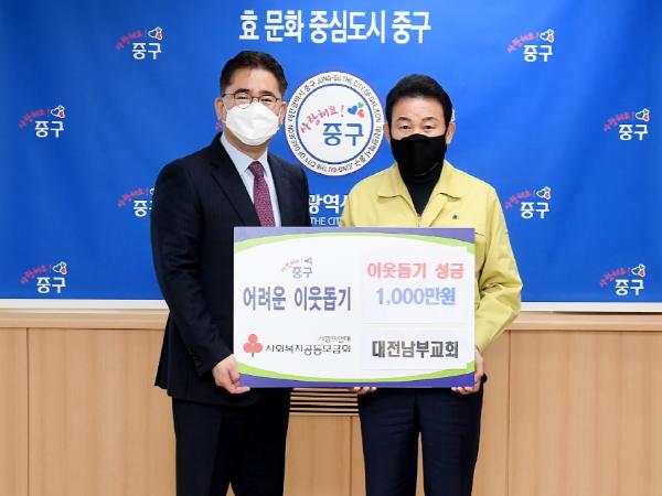 대전 중구(구청장 박용갑)는 청사 구민사랑방에서 대전남부교회(담임목사 류명렬)와 이웃돕기 성금 기탁식을 가졌다고 26일 밝혔다.