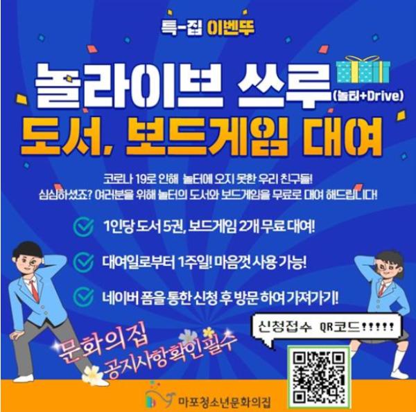마포구(구청장 유동균)는 지역 주민과 청소년들의 여가 지원을 위해 도서와 보드게임을 드라이브 스루 방식으로 대여하는 ‘놀라이브 쓰루(놀터 드라이브)’를 지난 4월 8일부터 무료로 운영하고 있다고 밝혔다.