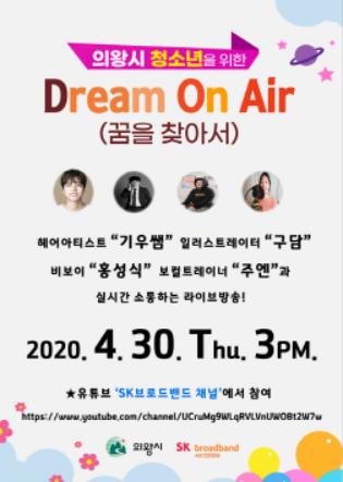 의왕시(시장 김상돈)는 코로나19 장기화로 인해 개학 연기와 사회적 거리두기로 대부분의 시간을 집에서 보내고 있는 청소년들을 위해 온라인 진로 멘토링‘Dream On Air(꿈을 찾아서)’를 오는 30일 오후3시부터 유튜브 ‘SK브로드밴드 채널’을 통해 라이브 방송으로 진행한다고 밝혔다.