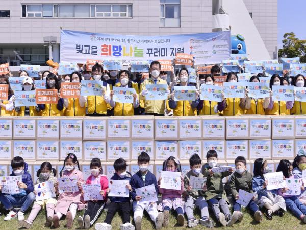 광주광역시는 27일 오전 시청 앞 잔디광장에서 이용섭 시장, 청년자원봉사자, 시청어린이집 어린이 등 100여 명이 사회적 거리두기를 유지한 채 ‘빛고을 희망나눔 꾸러미’ 제작행사를 개최했다.