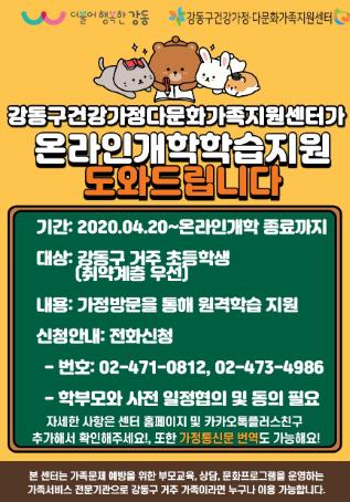 이에 강동구에서 취약계층 아동의 ‘학습권 보장’으로 차별없는 교육환경을 조성하기 위해 「방문학습 지원사업」을 추진하고 있다. 방문학습 지원 신청 가정에 방문해 단말기 세팅, 교육플랫폼 회원가입·로그인·학습하기 등 원격학습을 도와주는 사업으로 온라인개학 종료 시까지 진행된다. 지역 내 저소득 및 맞벌이 가정의 초등학생이라면 누구나 이용할 수 있으며 신청은 강동구건강가정·다문화가족지원센터로 하면 된다.