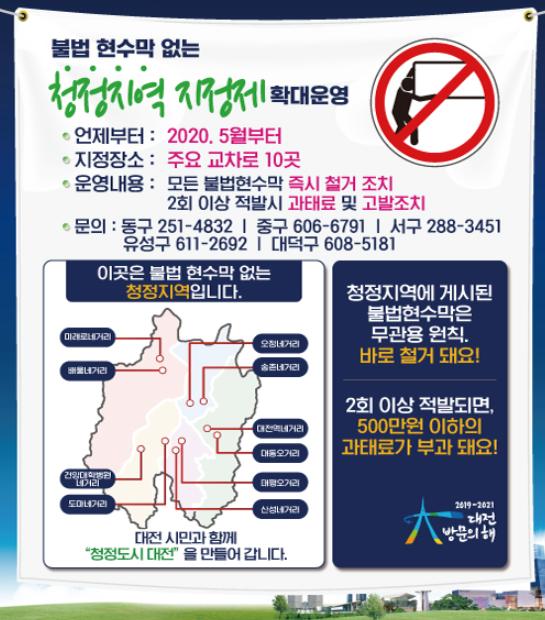 한편, 대전시가 지난해 4월 29일 전국 최초로 도입한 ‘불법현수막 없는 청정지역 지정제’는 주요도심 교차로의 불법 현수막을 차단해 깨끗한 가로환경을 조성, ‘청정도시 대전’을 만들기 위한 옥외광고 단속 시스템이다.