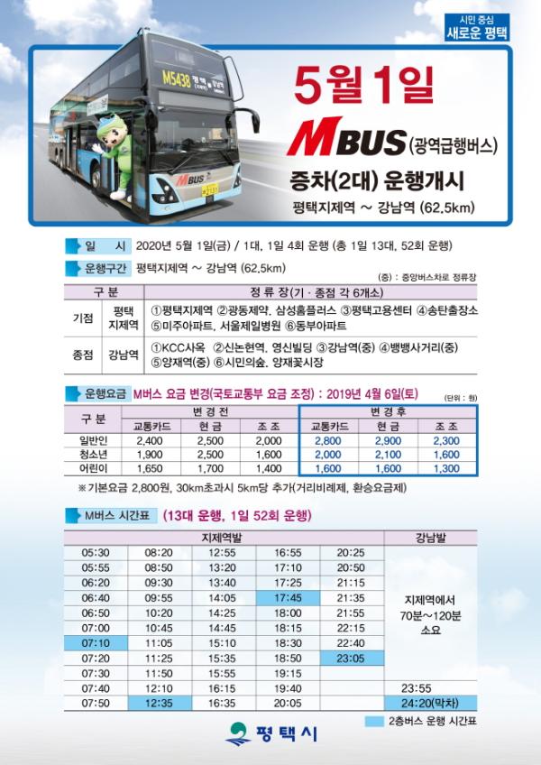 평택시(시장 정장선)는 28일, 평택 지제역~강남역 노선을 운행 중인 광역급행버스(M5438)가 5월 1일부터 2대 증차된다고 밝혔다.