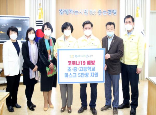 광명시는 27일 학생과 교직원들의 코로나19 예방을 위해 보건용마스크 5만매를 광명교육지원청에 전달했다.