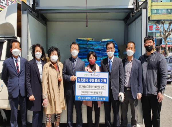 대전 서구(구청장 장종태) 도마2동(동장 노옥자) 행정복지센터는 지난 27일, 도마·변동 11구역 재개발정비사업조합(대표 성우경)으로부터 210만 원 상당의 백미(10kg) 70포를 기탁받았다.