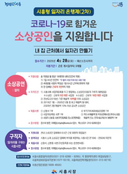 시흥시(시장 임병택)가 코로나19로 인한 소비 침체에 어려움을 겪고있는 소상공인들의 경제적 부담을 줄이고, 구직자들의 생계유지를 위해 ‘시흥형 일자리 은행제(2차)’를 4월 28일부터 확대하여 추진한다.