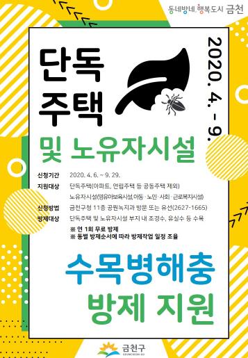 금천구(구청장 유성훈)는 생활권 수목 보호를 위해 지난 4월부터 9월 말까지 단독주택 수목 병해충 방제작업을 무료로 지원한다고 밝혔다.