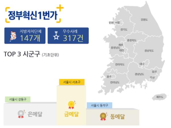 서울 서초구(구청장 조은희)는 행정안전부가 운영하는 ‘정부혁신 1번가’의 ‘우수 혁신 사례’ 부문 전국 243개 지방자치단체 중 금메달을 획득했다고 밝혔다. '정부혁신1번가'는 국민과 함께 정부혁신을 추진하기 위해 행정안전부가 2018년 7월 개설한 공공계정으로서‘정부혁신 사례 지도’에는 인증받은 전국 중앙 및 지방 지자체들의 우수 혁신 사례들이 실려있다.