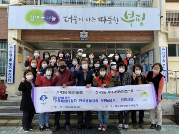 인천시 부평구(구청장 차준택)산곡3동 통장자율회와 지역사회보장협의체는 지난 28일 ‘저소득 거동불편 대상자 한시생활지원 부평e음카드 전달사업’ 발대식을 진행했다.
