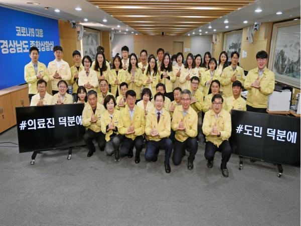 28일 경남도청에서 김경수 지사와 <경상남도 코로나19 대응 종합상황실> 근무자들이 의료진과 도민들에게 고마움을 전하는 '덕분에 챌린지'에 참여하고 있다.