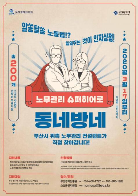 부산시와 부산경제진흥원은 소규모 사업장과 취약노동자의 노동권익 보호 지원을 위해 작년에 이어 올해에도 2020 동네방네 노무관리 지원사업을 추진한다고 밝혔다.