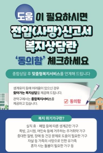 ‘전입·사망신고서를 활용한 위기가정 발굴 사업’은 전입·사망신고서 양식에 복지상담 동의여부를 묻는 문구를 삽입해, 주민이 상담 동의 란에 체크하여 제출할 경우, 종합적인 복지 상담을 제공하는 사업이다.