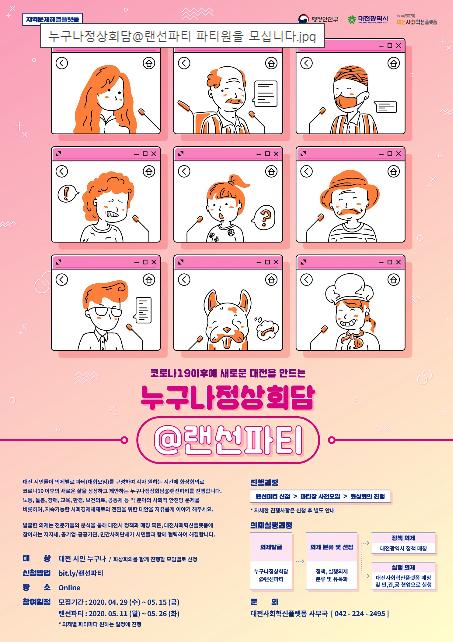 시는 코로나19 이후의 새로운 대전을 만드는 변화된 대응 의제를 직접 발굴하는‘누구나정상회담@랜선파티’파티원 1,000여 명을 오는 15일까지 모집할 예정이다.