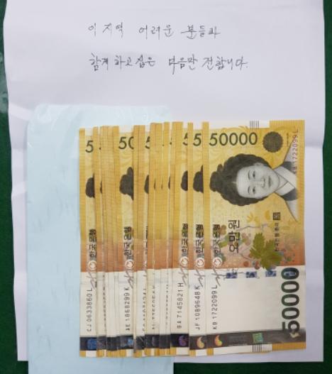 불러도 뒤도 돌아보지 않은 독지가가 주신 편지봉투에는 “이 지역 어려운 분들과 함께 하고 싶은 마음만 전합니다.”라고 쓰여 진 편지와 현금 5만원권 20장이 들어있었다.
