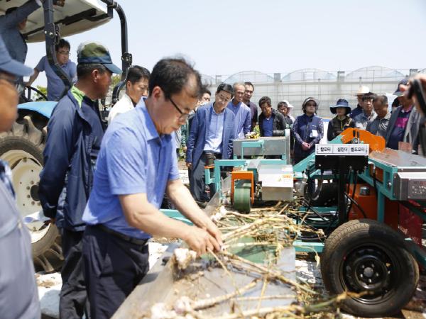이후 지난해 5월 농가, 농협, 유관기관 등 100여 명을 대상으로 시연회를 개최했으며, 농가들의 의견을 반영해 최종 개발을 완료했다. 특히 트렉터 견인식에서 부착식으로 변경하고 무게와 크기를 줄여 운반과 작업의 편리성을 더하고 줄기절단 기능도 개선한 것으로 알려졌다.