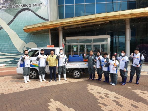 Fighting! 김천시 서포터즈(회장 이만수)는 4일 종합스포츠타운 개장에 앞서 일제 방역 소독을 실시하였다.