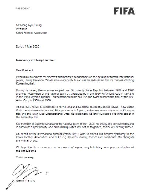 지안니 인판티노 국제축구연맹(FIFA) 회장이 1980년대 축구대표팀 간판 공격수 정해원 前 전남 드래곤즈 코치 별세 소식을 듣고 추모 편지를 4일 보내왔다.