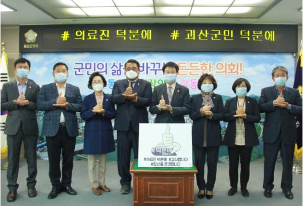 충북 괴산군의회(의장 신동운) 의원들이 코로나19 확산 방지와 조기 극복을 위해 현장 최 일선에서 헌신하고 있는 의료진을 응원하기 위해 4일 ‘덕분에 챌린지’에 동참했다.