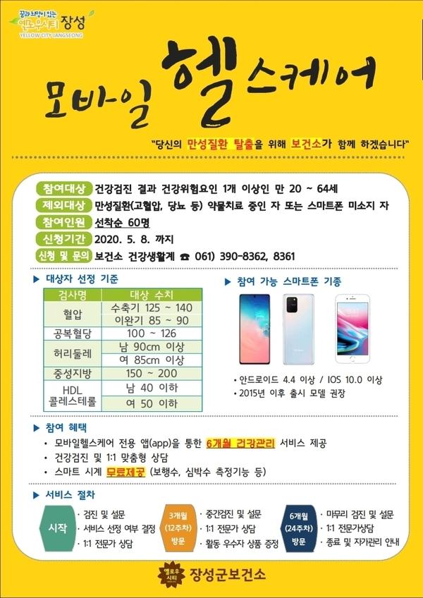 모바일 헬스케어 사업에 관한 자세한 사항은 장성군보건소 건강생활계(061-390-8361)로 문의하면 된다.