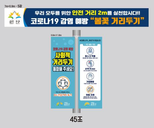 구는 4월 3일(금) 금천구청역, 독산역, 가산디지털단지역 입구 등에 ‘봄꽃 거리 두기’ 현수막을 내걸고, 안양천, 벚꽃로, 금나래중앙공원, 감로천생태공원, 금천체육공원 등 주요 산책로에 강도 높은 사회적 거리 두기 동참을 위한 가로등 배너기 105개를 게첨했다.