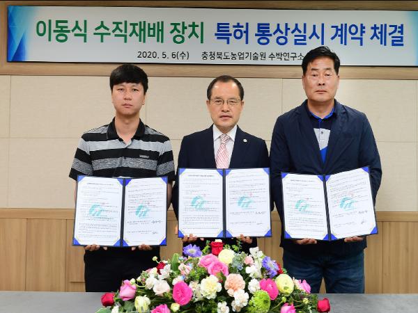 충북도농업기술원(원장 송용섭)은 5월 6일 수박 ‘이동식 수직재배 장치’ 특허기술을 대한아그로(대표 장한수), 오크(대표 이정봉) 업체에 통상실시 계약을 체결해 산업화에 성공했다고 밝혔다.