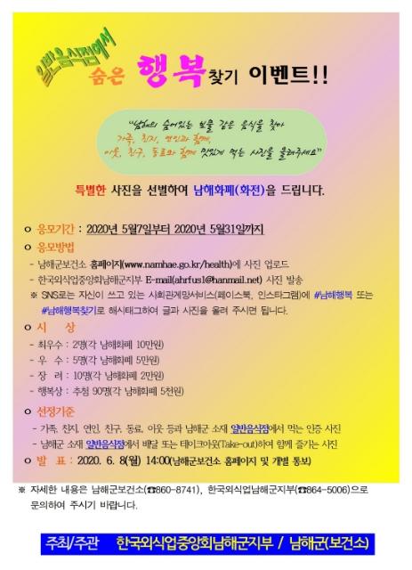 남해군보건소와 한국외식업중앙회 남해군지부(지부장 김윤상)에서 5월 가정의 달을 맞아 ‘숨은 행복 찾기’ 이벤트를 마련했다.