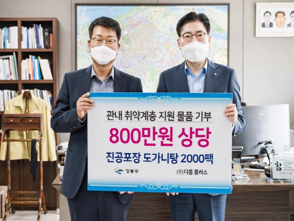이정훈 강동구청장이 지난 2일(목) 오후 구청장 집무실에서 관내 소재 기업인 ㈜다름플러스로부터 취약계층 지원 물품을 기부 받았다. 외식전문 프랜차이즈 기업인 ‘이차돌’을 창업·운영하는 ㈜다름플러스는 코로나19로 어려움을 겪는 취약계층 이웃들에게 전해 달라며 진공 포장된 도가니탕 2,000팩을 기부했고, 앞으로도 지역 나눔 활동에 참여할 뜻을 비췄다.