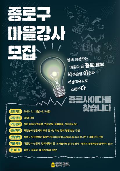 종로구(구청장 김영종)는 전문성과 친근함을 두루 갖춘 마을의 우수 인적자원을 활용해 주민들의 배움에 대한 욕구를 충족시키고자 「2020년 마을강사 ‘종로 사이다’」 모집에 나선다.