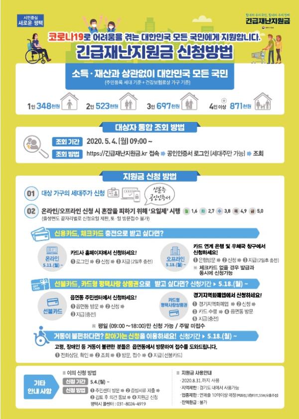 앞서 지난 4일, 긴급지원가구(생계급여, 기초연금, 장애인연금 수급 가구)는 별도의 신청이나 방문 없이 현금으로 지급 완료됐다.