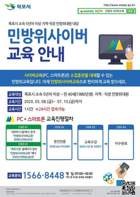 오는 5월 8일부터 7월 10일까지 64일간 실시되는 금년도 사이버 교육은 목포시 소속 5년차 이상 민방위 대원이면 전국 어디에서든 컴퓨터와 스마트폰을 이용해 수강할 수 있다.