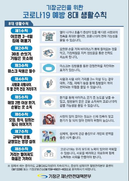 기장군은 지역감염 제로 유지와 코로나19의 보다 효과적 차단을 위해 정부의 코로나19 5대 기본수칙을 수정·보완하여 「코로나19 예방 기장군민 8대 생활수칙」을 확정했다.