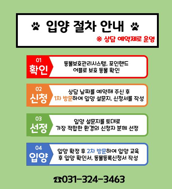동물보호센터에서 보호중인 유기동물을 입양하려면 우선 동물보호관리 앱인 포인핸드로 동물을 확인한 뒤 시 동물보호센터(031-324-3463)로 상담 일정을 예약해야 한다.