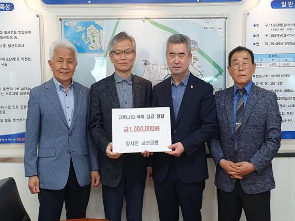 한경희 양사면장 직무대리는 "코로나19로 어려운 여건 속에서도 이웃에 온정의 손길을 전해 주신 교산교회 담임목사님과 성도들에게 감사드린다"며 "코로나19 극복을 위해 기탁해 주신 성금이 잘 쓰일 수 있도록 하겠다"고 말했다.