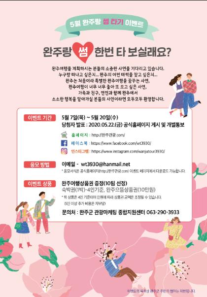 참여 이벤트는 20일까지 진행하며 완주군 관광마케팅 종합지원센터 홈페이지와 페이스북, 인스타그램을 통해서 참여 가능하다.