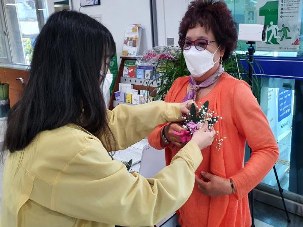 무주군 무주읍이 지난 8일 어버이날 맞아 행정복지센터 방문객들에게 카네이션을 달아줘 호응을 얻었다.