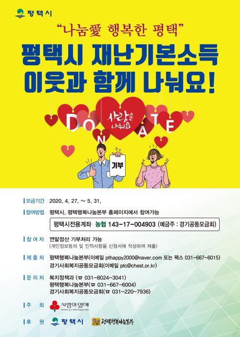 시는 이러한 분위기를 계속 확산하고 이어가기 위해, 지난달 27일부터 재난기본소득 특별모금 ‘나눔愛 행복한 평택’을 이달 31일까지 진행하고 있다. 정장선 시장을 비롯한 시 간부공무원과 공직자들이 솔선해서 기부를 시작했으며 일반 시민들도 더 어려운 이웃에게 재난기본소득이 쓰일 수 있도록 기부에 참여하고 있다.