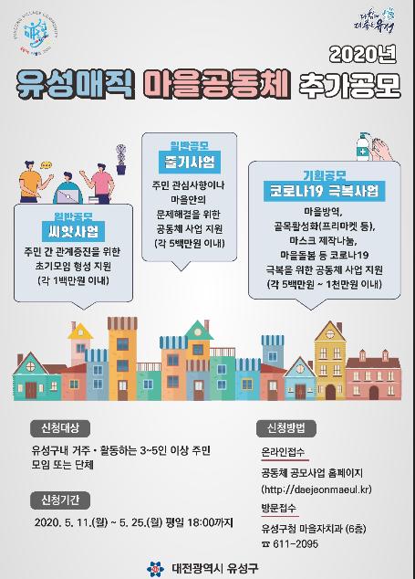 대전 유성구(구청장 정용래)가 11일부터 2020년 유성매직 마을공동체 공모사업을 추가 진행한다.