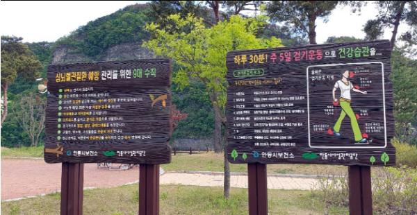 등산로 입구 안내문에는 등산 전·후 스트레칭 등 안전한 산행 방법이 게시돼 있고, 공원 등 시민 생활공간에는 올바른 걷기와 심뇌혈관 등 만성질환에 대한 정보가 게시돼 체계적인 건강관리 향상에 도움을 주고 있다.