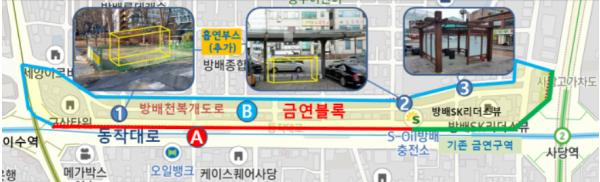 해당구간 내 흡연구역(부스)는 모두 개방형으로 설치ㆍ운영되어 기 설치된 1개소(방배천로 12, 파스텔시티 앞)외에 나머지 2개소(방배동 438-38 녹지대 및 방배천로 34 앞)는 인근주민 등 다양한 의견수렴 결과를 참고하여 간접흡연 피해가 없는 최적의 장소를 선정하여 5월중에 설치를 완료할 예정이다.