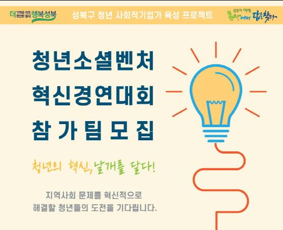 성북구(구청장 이승로)는 지역사회 문제를 창의적이고 혁신적인 방법으로 해결할 청년 사회적기업가 육성을 위해 「청년 소셜벤처 혁신경연대회」 참가팀을 모집한다.