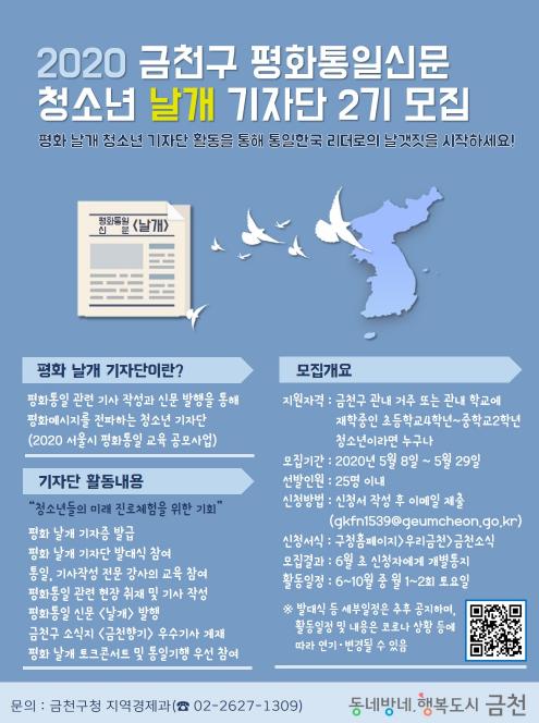 금천구(구청장 유성훈)가 청소년들의 평화?통일에 대한 감수성 제고를 위해 서울시 평화·통일 교육사업의 일환으로 ‘평화 날개 기자단’을 모집한다.