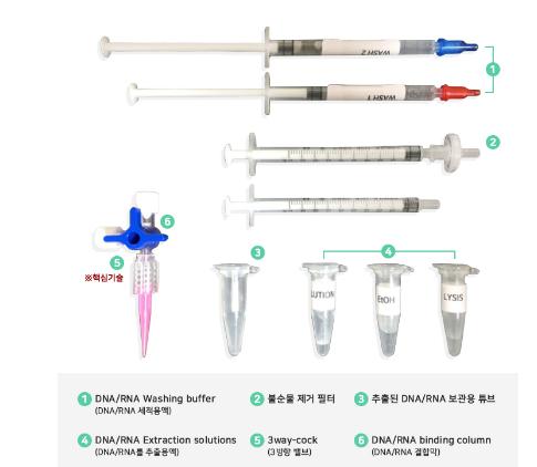 특수 제작된 주사기는 3방향 밸브(3-way cock)1)에 DNA/RNA가 붙을 수 있는 컬럼(Column)2)을 설치해 추출용액과 불순물, 그리고 순수한 DNA/RNA를 따로 분리할 수 있다.