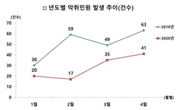서구는 올해 4월까지 접수된 악취 민원이 모두 113건으로 지난해 같은 기간의 201건에 비해 약 45%로 감소했다고 11일 밝혔다.