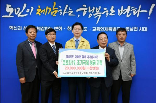 (사)대한곡물협회경남도지회(지회장 김승주)와 진수산업(주)(대표 박영식)이 코로나19 조기 극복을 위해 써 달라며 각 1000만 원씩 총 2000만 원을 경상남도(도지사 김경수)에 4월 3일 전달했다.