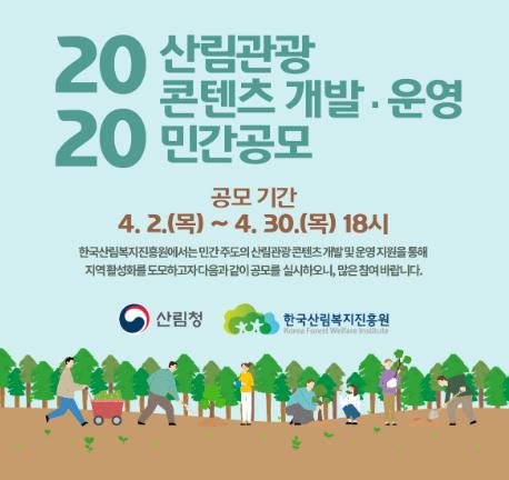 산림청(청장 박종호)은 지역 기반의 산림관광 콘텐츠를 발굴하고, 산림복지 분야의 일자리 창출을 위하여 ‘2020년도 산림관광 콘텐츠 개발·운영 민간 공모전’을 추진한다.