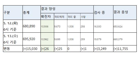 질병관리본부 중앙방역대책본부(본부장 정은경)는 5월 13일 0시 현재, 신규 확진자가 26명 발생하여 총 누적 확진자수는 10,962명(해외유입 1,142명(내국인 90.2%))이라고 밝혔다. 신규 격리해제자는 25명으로 총 9,695명(88.4%)이 격리해제 되어, 현재 1,008명이 격리 중이다.