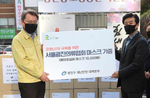 광진구(구청장 김선갑)가 3일 광진형 소상공인 지원센터 앞에서 서울광진의류협회로부터 마스크 1만 매를 기증 받았다.