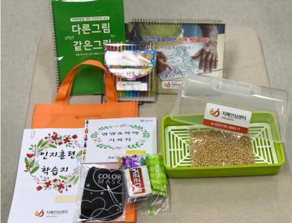 제공되는 인지키트에는 치매치료제 복약 안내, 영양관리 기록지 및 대상자의 인지기능을 고려한 수준별 인지훈련 학습지가 포함돼 있다. 또한, 치매환자의 정서적 지원과 성취감 증진을 위해 콩나물키우기 재료도 함께 제공하고 있다.