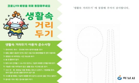 하남시는 방역과 일상생활이 양립하는 ‘생활 속 거리두기’ 실천을 위해 관내 대형음식점 192개소를 대상으로‘테이블 세팅지’20만장을 제작해 배부했다고 13일 밝혔다.
