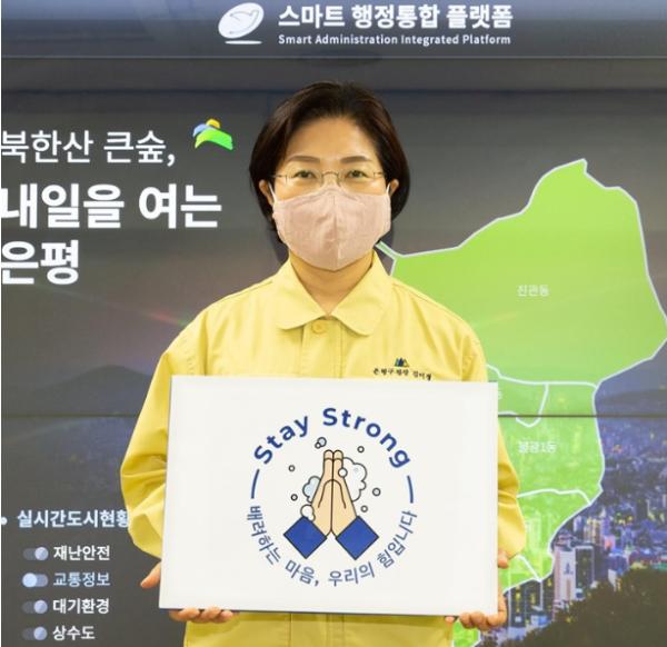 김미경 은평구청장은 지난 12일 이동진 도봉구청장의 지명을 받아 코로나19 극복 ‘스테이 스트롱(Stay Strong)’ 캠페인에 동참했다.